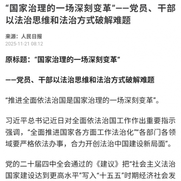匪共喉舌人民日报发表文章:“国家治理的一场深刻变革”——党员、干部以法治思维和法治方式破解难题。